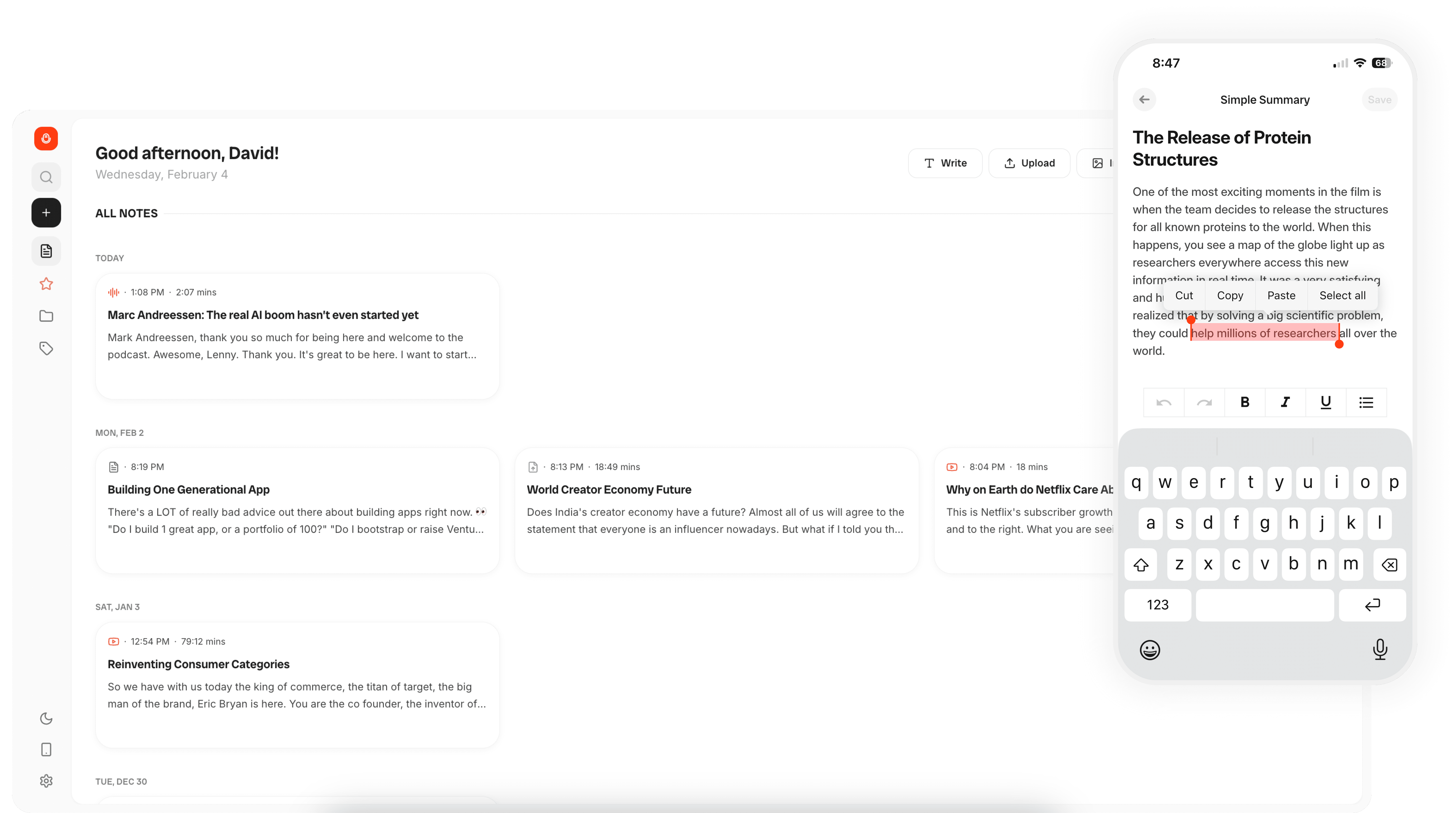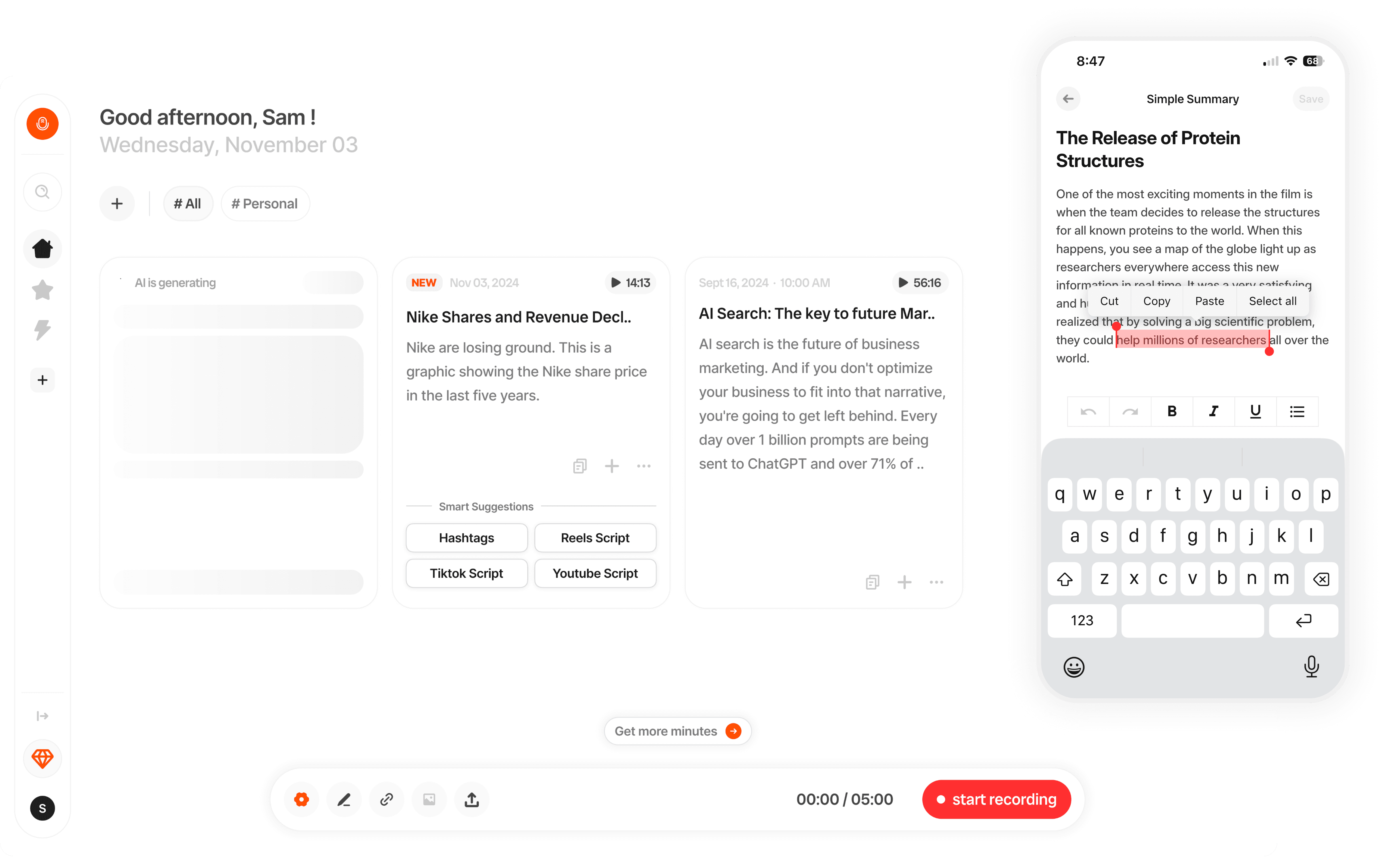 Instead of a giant wall of text, Audionotes creates concise summaries, highlights key ideas, and pulls out action items. Your ADHD notes become shorter, clearer, and easier to scan, so you can actually use them later.