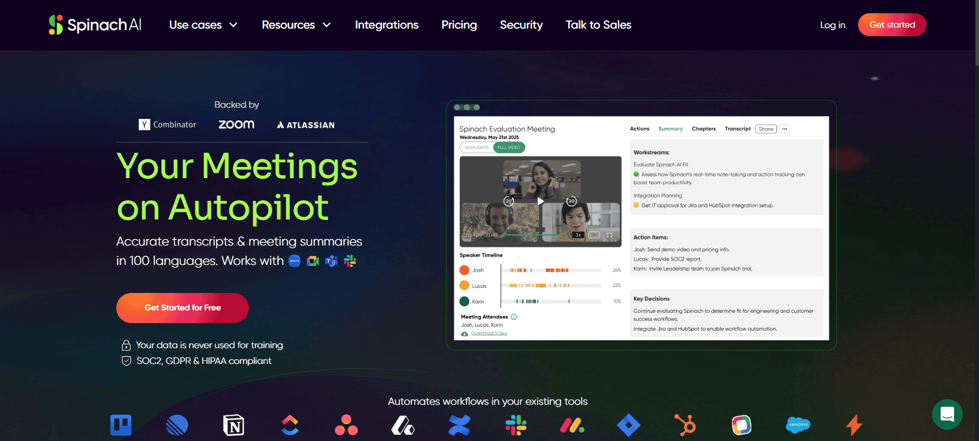 Spinach AI | Web with integrations like Slack and Jira | Captures meeting notes automatically, tracks action items, helps with sprint planning, stores project discussions, supports team collaboration | |