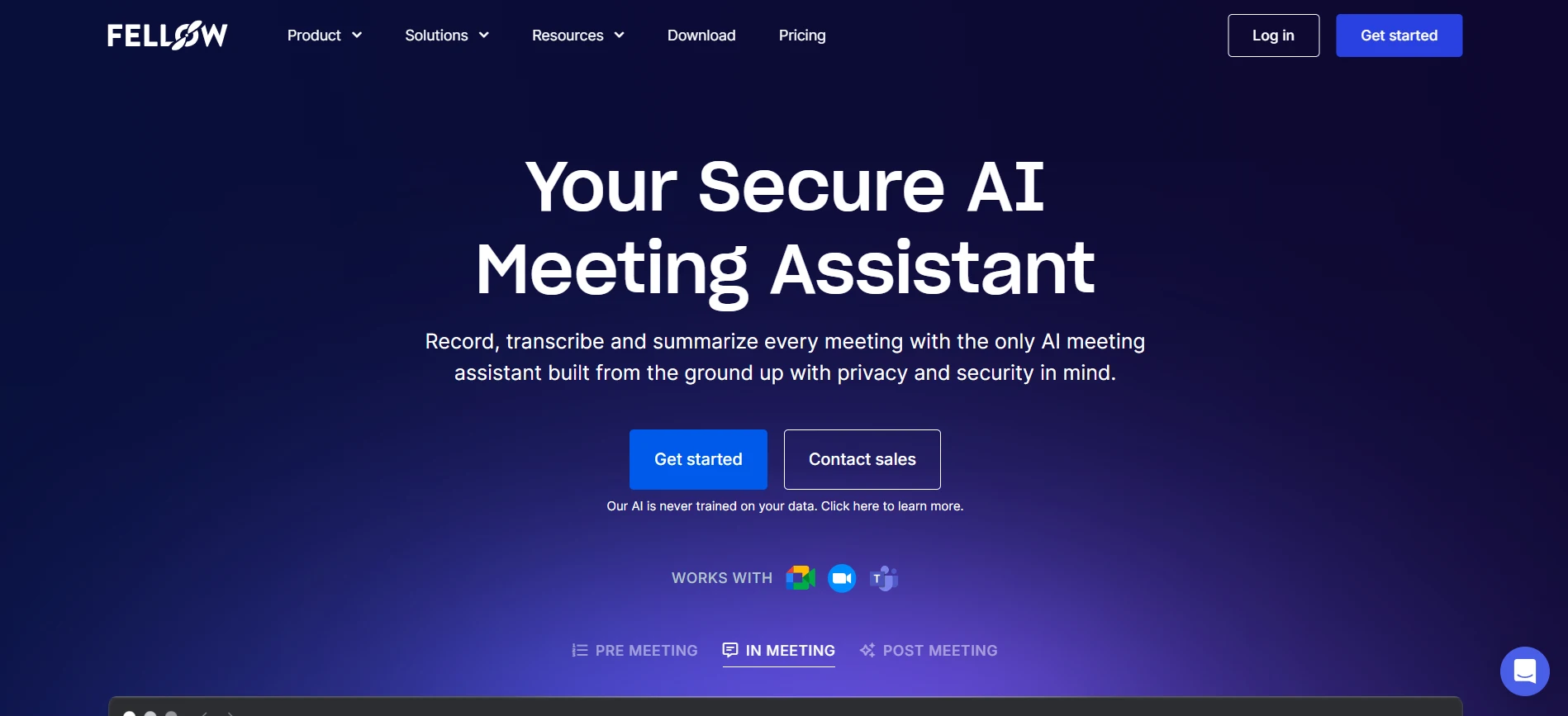 Fellow focuses on structured meeting management, not just transcription. It helps you plan agendas, take shared notes, and generate summaries, all while keeping data secure. It’s made for teams that need privacy and a clear system for running productive meetings.