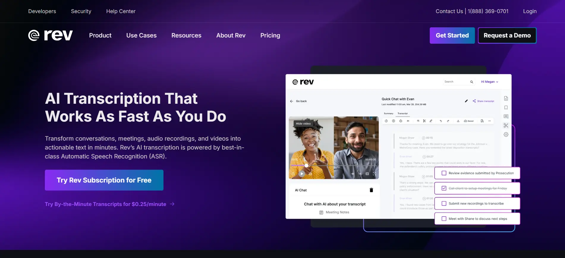 Rev is known for its accuracy. It offers both AI transcription and human-edited transcripts, so you can choose speed or precision depending on what you need. It’s popular in industries like healthcare, media, and law where every word counts. It also supports captioning and subtitles for video content.