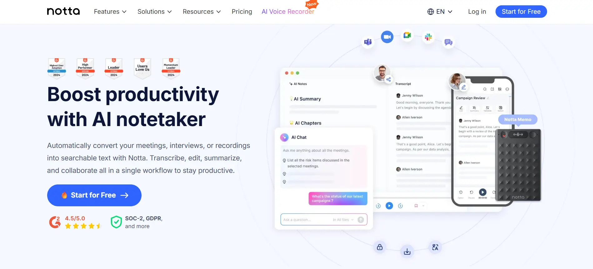 Notta is a clean, modern transcription platform that stands out for its multilingual support. It handles over 100 languages, offers live meeting transcription, and gives you summaries and suggested action items. You can transcribe in real time or upload files, and it works across different devices with a strong focus on usability.