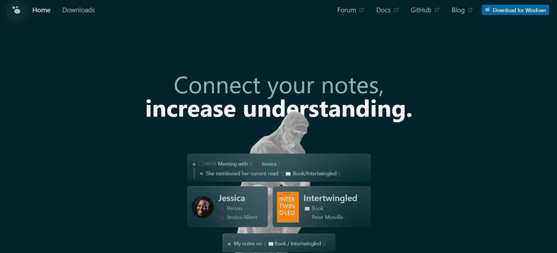 Logseq is a free, open-source, local-first tool that stores your data as Markdown or Org-mode files. It works as a block-based outliner, meaning every idea is a block you can link, reference, and reuse. It also offers a graph view, whiteboards, flashcards for spaced repetition, and advanced querying for pulling out information from your notes. For researchers, the PDF annotation and Zotero integration are a big plus. If you want something powerful but still want control and portability, Logseq is a solid pick.