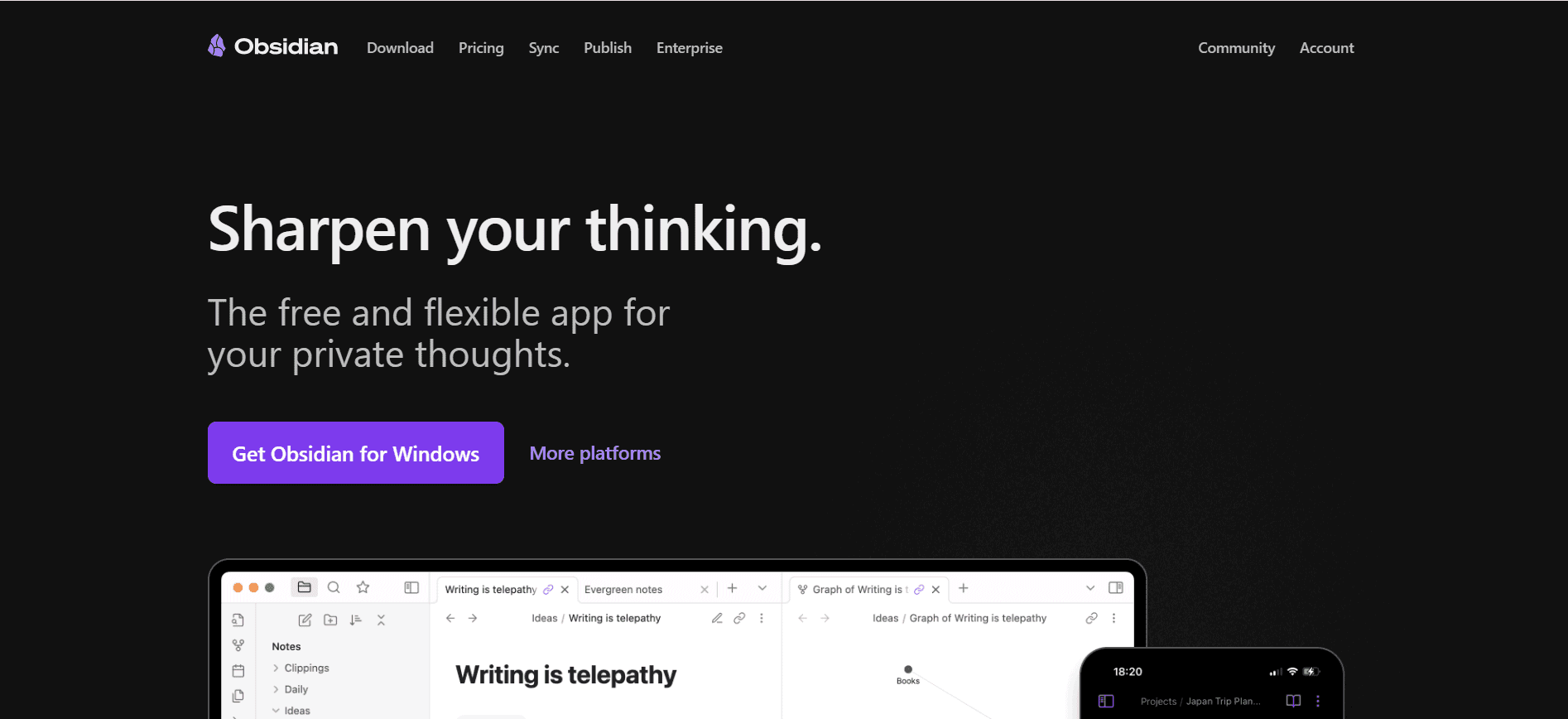 Obsidian | Bidirectional links, graph view, plugins | Writers, researchers | Free personal use + Sync $4/mo, Publish $8/mo | Windows, macOS, Linux, Mobile |