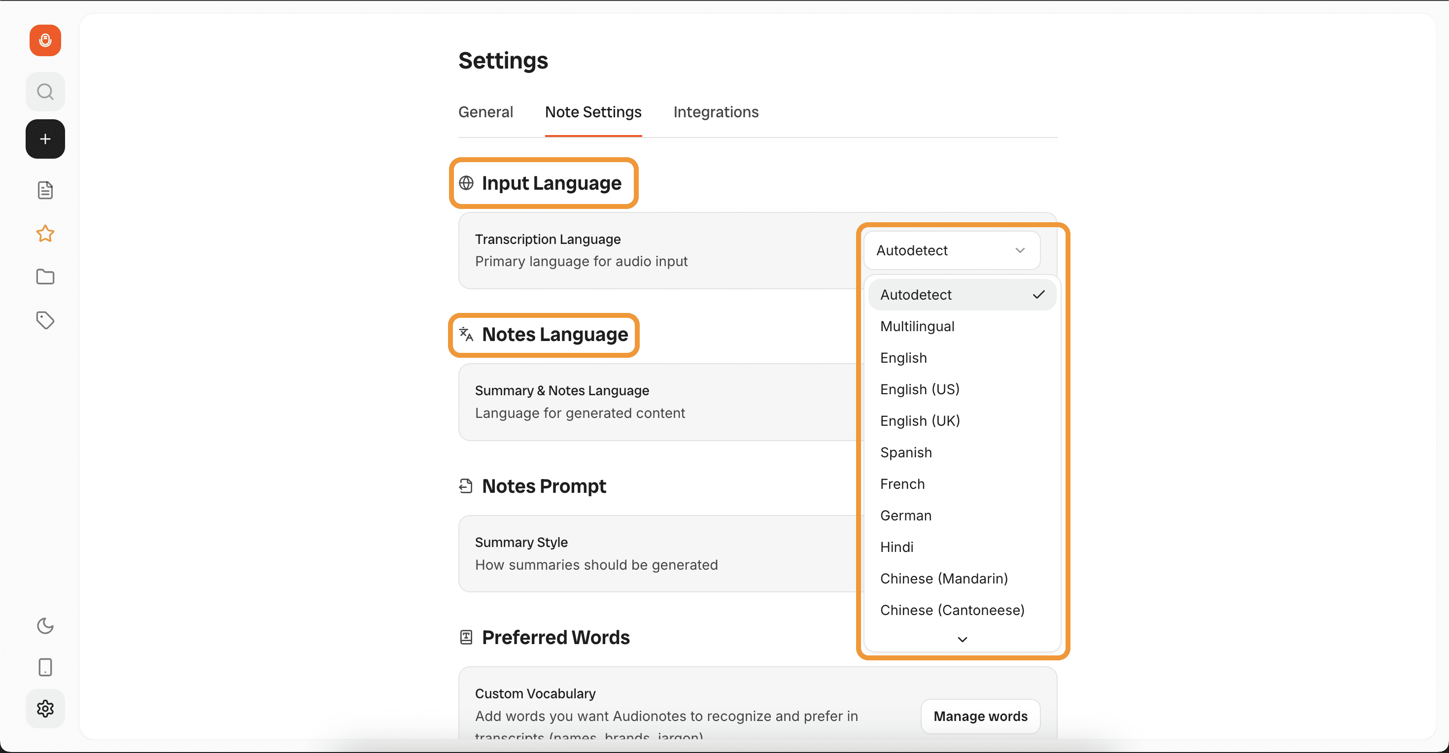 Changing your language setting adjusts transcription recognition, it doesn't translate existing content. To get summaries or AI-generated content in different languages, adjust your output language in Settings or use the language selector in AI Create.
