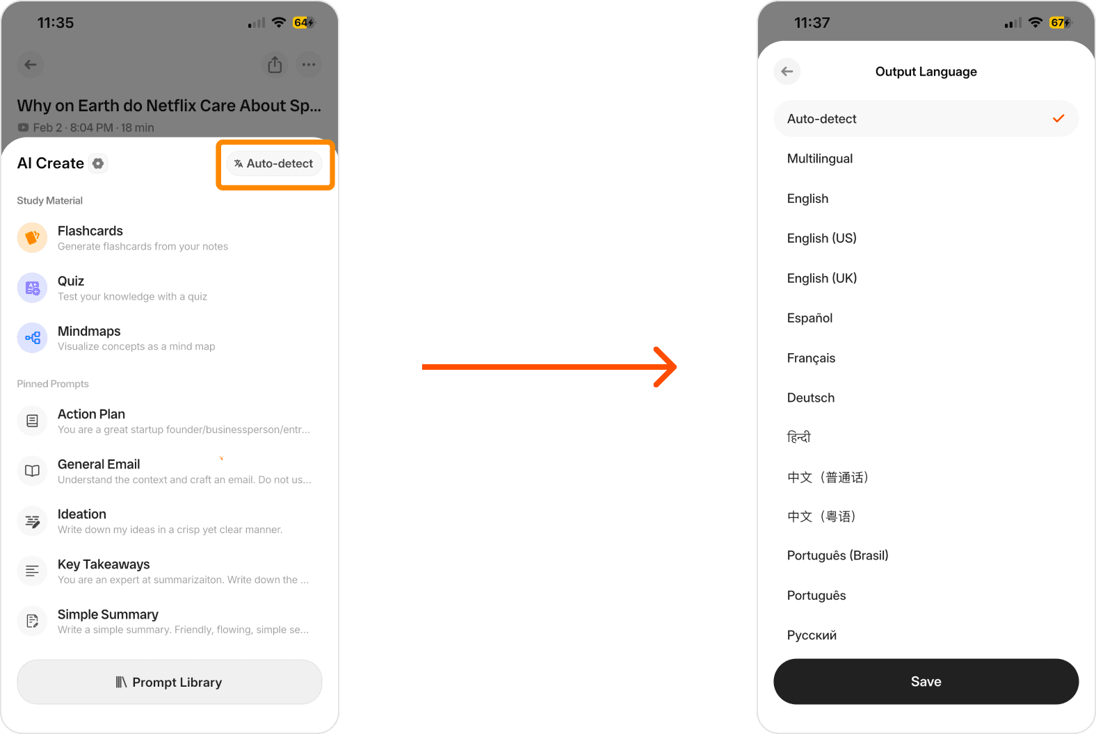 Smart Auto-Detection: AudioNotes automatically identifies your spoken language, so you can start recording right away without manual setup.
