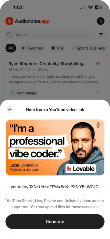 Audionotes automatically transcribes your video file and generates a summary for you in your preferred language.